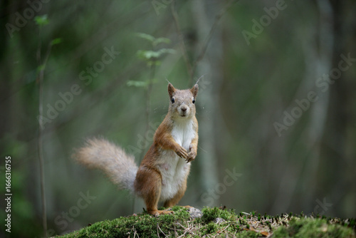 Obraz premium Red squirrel. A wild squirrel stands on its hind legs on a stone covered with green moss. A cute rodent in a summer shady forest
