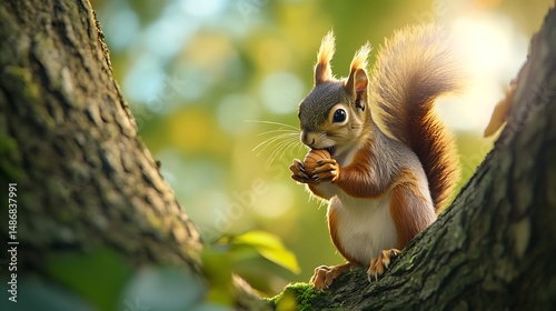 © Kira, Obraz premium Red squirrel eating nut on tree branch