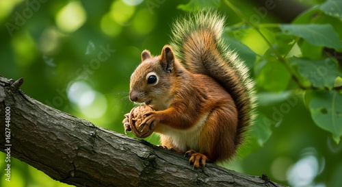 © Yulichatun, Obraz premium Red squirrel eating nut on tree branch
