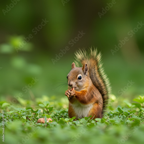 © MdMasud, Fototapeta premium Red Squirrel Eating Nuts in Green Forest