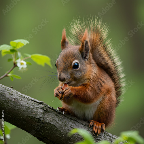 Fototapeta premium Red Squirrel Eating on Tree Branch in Forest