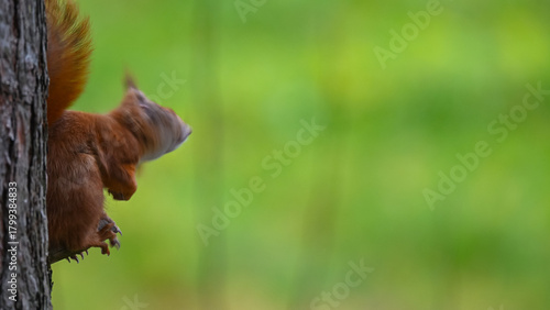 © Krzysztof, Fototapeta premium Red Squirrel Eating on Tree Trunk with Vibrant Green Copy Space