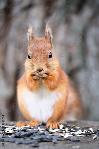 © Александр Овсянников, Fototapeta premium Red squirrel eats sunflower seeds sitting on a hemp. A close-up.
