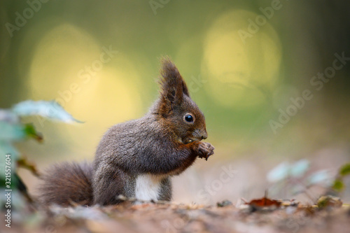 Fototapeta premium Red squirrel eats the nut in the natural environment, beautiful bokeh, close up, Sciurus vulgaris