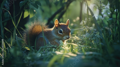 © Mbok, Obraz premium Red Squirrel in Sunset Meadow.