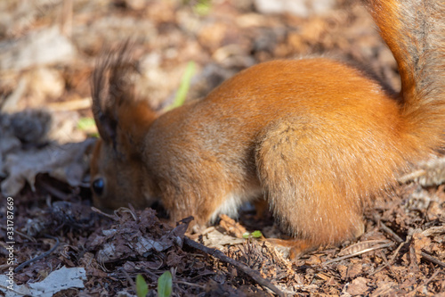 Fototapeta premium Red squirrel in the park hides a nut