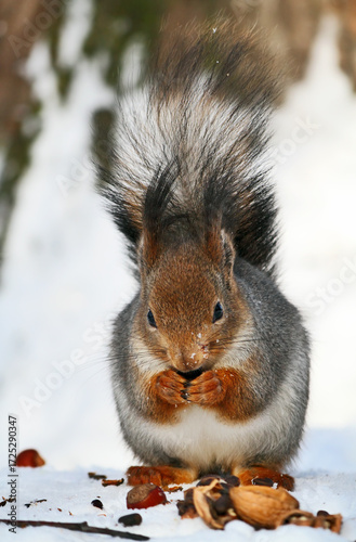 Fototapeta premium Red squirrel is eating nuts on the snow.