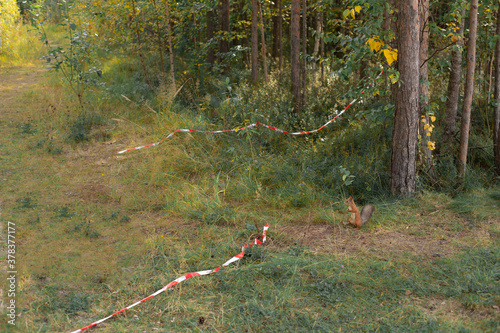 © Ekaterina, Naklejka premium Red squirrel is looking at caution tape, red and white striped plastic tape tied and crossed on trees . The concept of forests under threat of extinction. Unsuitable habitat for wild animals.