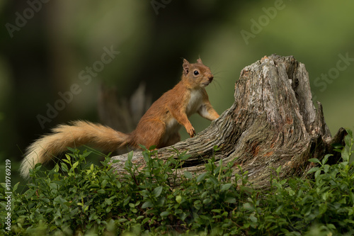 © L Galbraith, Naklejka premium Red Squirrel looking for food on a tree stump with a green background.