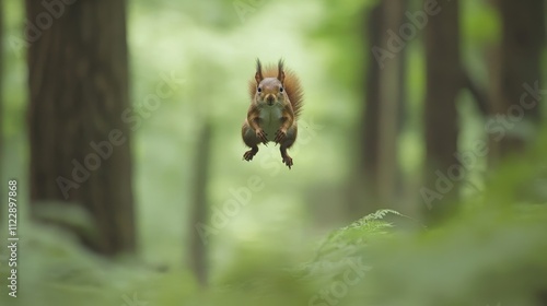 © siti, Obraz premium Red squirrel mid-leap in a lush forest.
