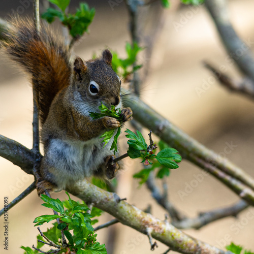 © Anne, Obraz premium Red squirrel munching on fresh foliage.