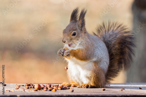 © alexbush, Fototapeta premium red squirrel on a branch in autumn
