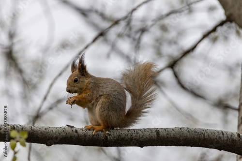 © Sergey, Obraz premium Red squirrel on a tree in a park in spring.