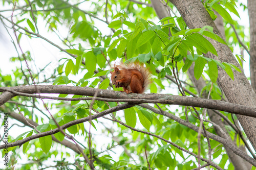 © Александр Нестеров, Obraz premium Red squirrel on a tree with a bump in its paws