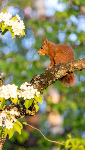 © Walhadi, Obraz premium Red Squirrel on Branch, Spring Blossoms