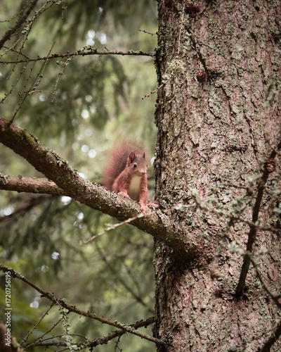 © JerreMaier, Obraz premium Red squirrel on tree branch in conifer forest close up