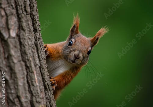 © Vooglo.com, Fototapeta premium Red squirrel peeking around a tree trunk in a natural green setting