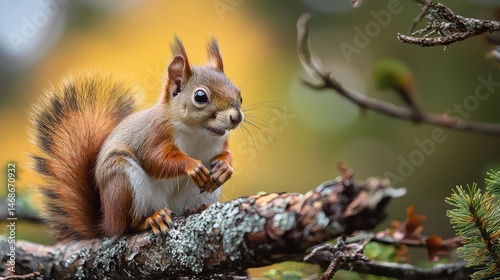 Obraz premium Red Squirrel Perched on a Mossy Branch With a Blurred Green and Yellow...