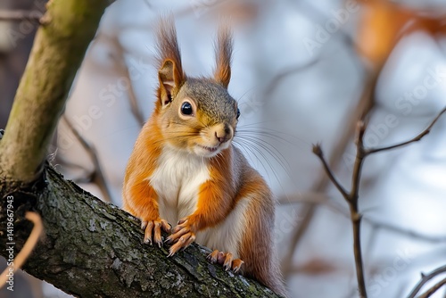 © atar, Fototapeta premium Red Squirrel Perched On A Tree Branch In Natural Environment With Focus
