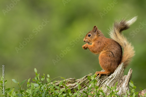 Fototapeta premium Red squirrel perched on a tree stump eating a nut with a green background.