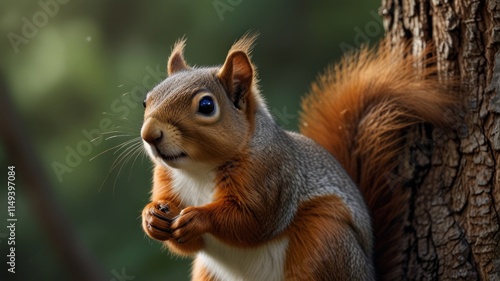 © titik, Obraz premium Red squirrel perched on a tree trunk, looking curious.