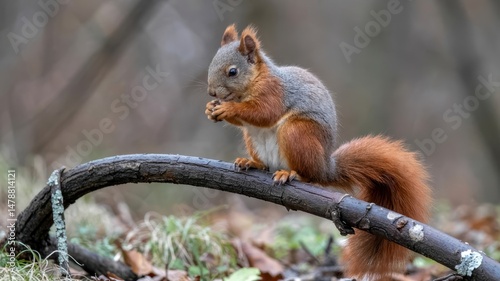 © Nemanja, Obraz premium Red squirrel perched on tree branch eating nut in forest setting