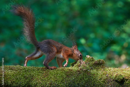 Naklejka premium Red squirrel ,,Sciurus vulgaris,, in deep danube forest in summer, Slovakia,...