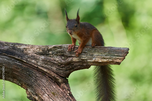 Obraz premium Red squirrel ,,Sciurus vulgaris,, in deep danube forest in summer, Slovakia,...