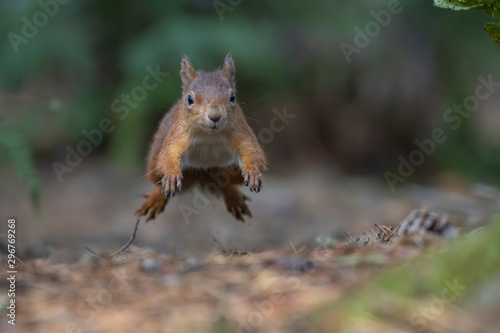 © Paul, Fototapeta premium red squirrel, Sciurus vulgaris, running mid air along forest floor ground with pine cones/needles displaying running gait during autumn with orange and red colours in Scotland.