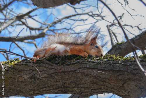 Fototapeta premium Red Squirrel sits on a tree in the spring at sunny day