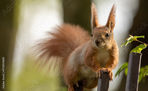 Fototapeta premium Red squirrel sitting on a tree, close-up.
