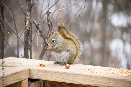 © Alona, Obraz premium Red Squirrel Sitting on a Wooden Post in Winter Forest
