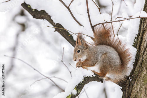 Obraz premium red squirrel sitting on tree branch and eating nut closeup. winter park scene...