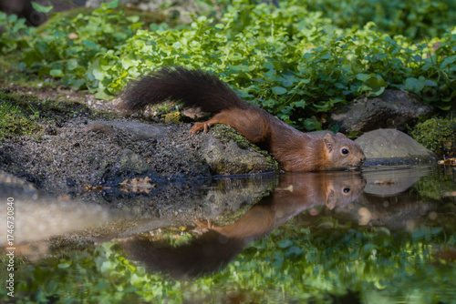 © CaptainCat, Obraz premium Red Squirrel stretched over rock drinking from forest pond with clear reflection
