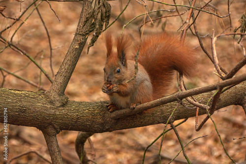 © Ruslan, Fototapeta premium red squirrel with walnuts in the autumn forest among the leaves