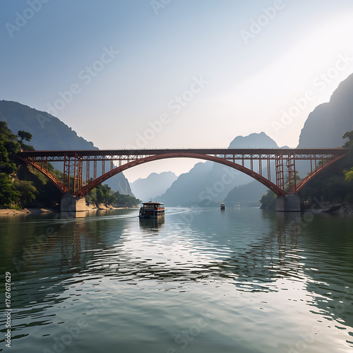 © Ume, Fototapeta premium Red Steel Arch Bridge Over Calm River with Tour Boat