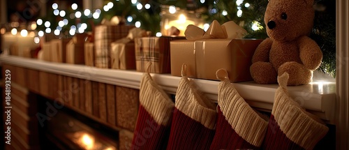 © lililia, Obraz premium Red stockings hang by the fireplace while a beautifully decorated Christmas tree stands next to neatly wrapped gifts on the floor