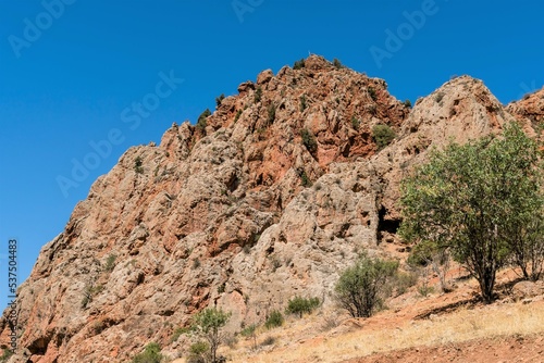 © Dmirii, Fototapeta premium Red structural rock against the blue sky in the mountains of Armenia.