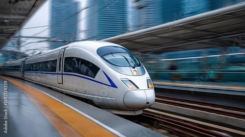 © Oksana, Fototapeta premium Red subway train approaching platform in urban station during cloudy day with large windows showcasing city view