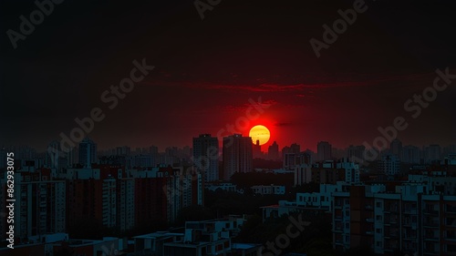 © R-CHUN, Fototapeta premium red sun in the heart of darkest night city.