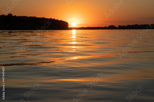 © Svetlana, Fototapeta premium Red sunset on the river. Evening. The rays of the sun in the clouds