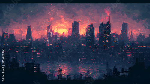 Fototapeta premium Red Sunset Over a Pixelated City Skyline