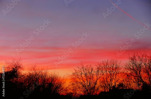 Obraz premium Red sunset with clouds and trees silhouettes