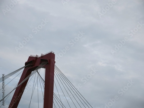 © Ena, Fototapeta premium Red suspension bridge tower against dramatic cloudy sky, architectural close-up with steel cables. Engineering marvel, iconic structure, urban infrastructure, minimal color contrast.