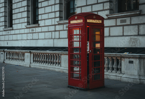 Fototapeta premium Red telephone booth on a city sidewalk near a building, London, UK