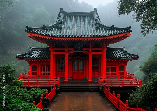© Arii, Obraz premium Red temple with misty mountain.