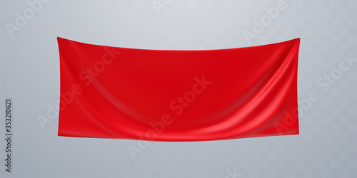 © maximmmmum, Naklejka premium Red textile advertising banner mockup. Vector 3d illustration. Hanging wrinkled fabric. Stretched canvas. Folded sheet. Template for placing ads