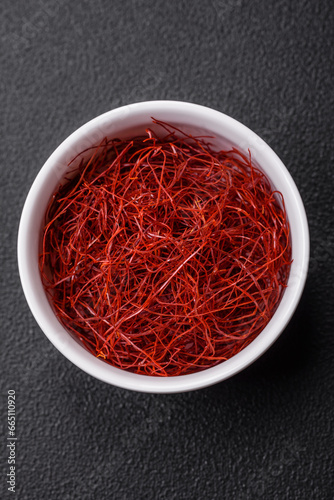 © chernikovatv, Naklejka premium Red thin hot chili threads on a dark background