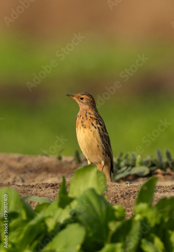 Fototapeta premium Red throated pipit on green at Buri farm, Bahrain
