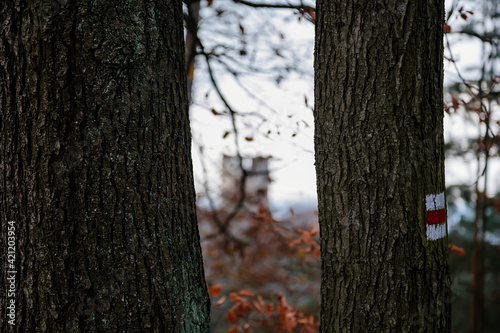 © AnnaRudnitskaya, Fototapeta premium Red tourist route hiking sign, traditional colorful Czech tourist marking on trails, autumn forest in Bohemian Paradise Protected landscape Area, Czech Republic